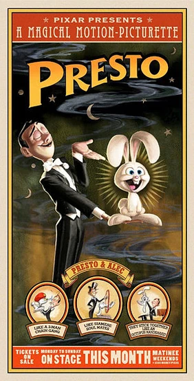 Presto es un cortometraje lanzado con el estreno de la película WALL • E . Doug Sweetland hizo su debut como director con la película, y también las voces de los dos personajes principales, Presto y Alec Azam . La película trata de un mago y su conejo hambriento, Alec Azam. Al principio del corto, Alec se ve encerrado en su jaula tratando de alcanzar una zanahoria pulgadas fuera de su alcance. Presto viene después de una demostración para probar su truco de magia de sacar a Alec de un sombrero. Después ve a la que el truco funciona, Presto sube al escenario para comenzar su espectáculo, dejando a Alec pensando que va a ser alimentado la zanahoria. Cuando Presto intenta realizar el truco en el escenario, no puede encontrar a Alec, y mira a ver que Alec había tomado el sombrero. Agitado, Presto trata de llegar a Alec, pero acaba tirando una ratonera de la manga en su lugar. Para tratar de rescatar a Alec a poner el sombrero, Presto lanza un huevo en el sombrero, sólo para que suba y lo golpeó en el ojo. Presto a continuación, hace aparecer una zanahoria, se pone el sombrero utiliza para agarrar a Alec. Luego se vuelve la zanahoria en una flor, por lo que Alec enojado, y poner el sombrero de otro en un tubo de aire, haciendo Presto roja la cara y el pelo hacia arriba. Una vez más trata de agarrar Alec, pero Alec mete la mano en una toma de corriente, electrocutando Presto. Frustrado y furioso, Presto intenta rescatar a Alec una vez más, pero obtiene sus pantalones rasgados apagado. A continuación, ve una escalera, y los intentos de golpe Alec con él, sino que es golpeado por la escalera, cuando se dispare de la manga.Muy enojado ahora, se persigue a Alec detrás del escenario, y es tirado por la cuerda a bis en el aire, pero pronto se desliza y cae con muchos objetos pesados que caen sobre él. Alec luego guarda Presto de ser aplastado por haciéndolo caer en el sombrero. Tras una breve pausa, la multitud empieza a animar para Alec y Presto. Alec, de mal humor, comienza a alejarse cuando se llama Presto que se acercara. Para animar a Alec, Presto hace aparecer una zanahoria, que Alec se come cuando sale del sombrero.